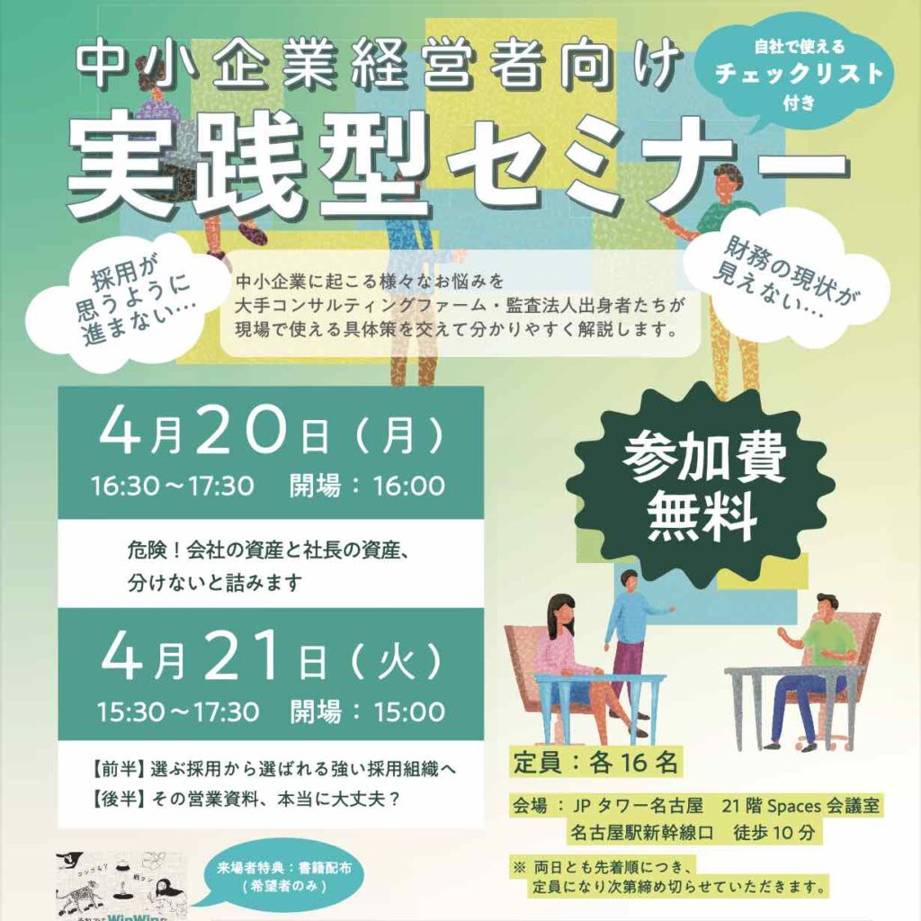 【有料級コンテンツが無料!】合同セミナーを開催します株式会社Sosai、諸石公認会計事務所と合同セミナーを名古屋で開催しました。全10社の経営者の方を対象に3つのテーマで実施。今後、定期的に開催をしていく予定ですので、ご興味のある方は是非ご参加ください。 【4月の […]
